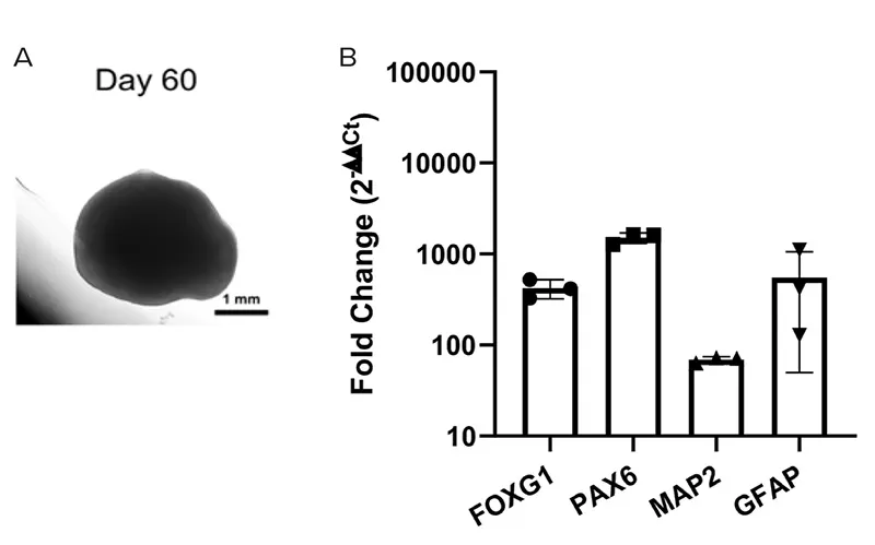 図3. (A) STEMdiff™ Dorsal Forebrain Organoid Kitを用いて作製された60日目の背側前脳オルガノイドの代表的な明視野画像。(B) 60日目の背側前脳オルガノイドに対するRT-qPCR解析。結果は、前脳特異的マーカーFOXG1、前駆細胞マーカーPAX6、神経マーカーMAP2、グリアマーカーGFAPの発現上昇を示しています。結果はLog₁₀(Fold Change:2-∆∆Ct法)として表示されており、平均値 ± 標準誤差(n = 3オルガノイド)で示されています。データはTBPに対して正規化され、未分化のhPSCコントロールと比較されています。