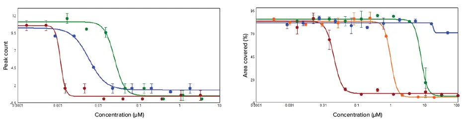 データはSoftMax Proソフトウェア内のPeak Proアルゴリズムで解析されました(図3左)。拍動測定後、同じ細胞をCalcein AMで染色し、MiniMaxサイトメーターでイメージングして細胞生存率を評価しました。濃度反応曲線は、化合物濃度に対する生存細胞面積としてプロットされました(図3右)。
