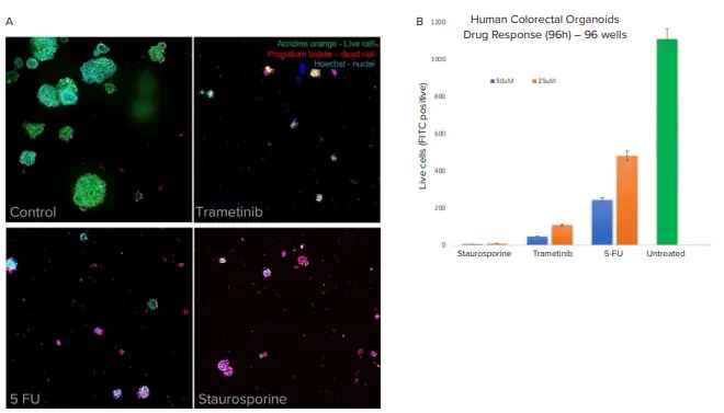 図7. A)Day 2にトラメチニブ、フルオロウラシル(5-FU)、スタウロスポリン(各50µMおよび25µM)で処理し、Day 6に染色およびイメージングを実施しました。B)薬剤処理後のオルガノイド1個あたりの平均生細胞数を定量化しました。