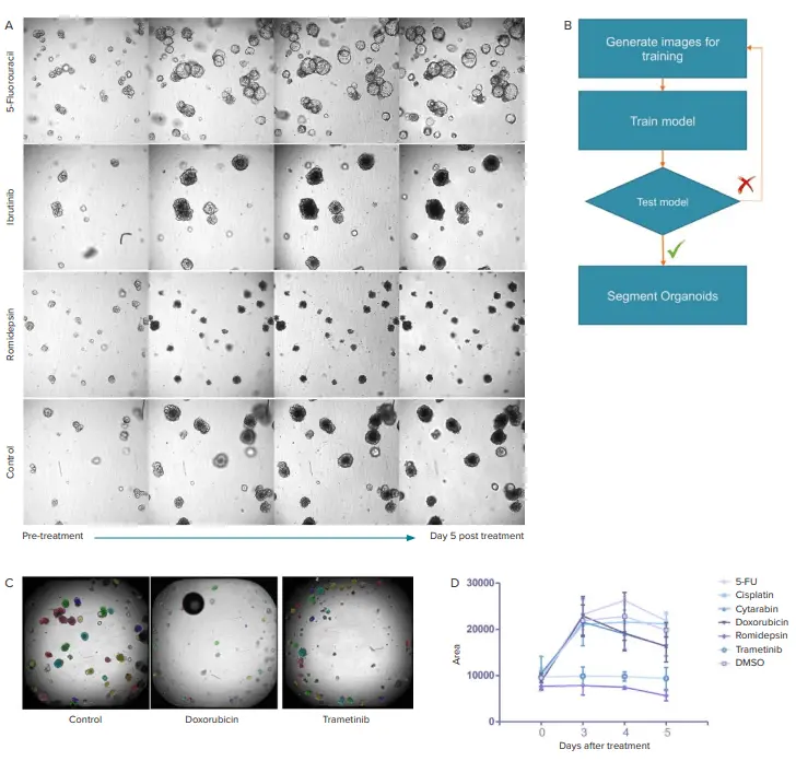 図4. A)Matrigel中のCRCオルガノイドの代表的な画像。化合物処理後、5日間にわたり観察を行いました。B)IN Cartaソフトウェア内のSINAPワークフローの概要。オルガノイドのセグメンテーションモデルを生成するためのプロセスを示しています。C)透過光画像は、非均一な背景やエッジ効果、気泡などのアーティファクトが多く、堅牢なセグメンテーションを妨げます。ここでは、セグメンテーションマスクを重ねた代表的な画像を示しています。SINAPモデルによりCRCオルガノイドのセグメンテーションを実現しました。D)DMSOコントロールと各化合物(5-FU 5µM、シスプラチン 2.5µM、シタラビン 50µM、ドキソルビシン 15µM、ロミデプシン 2.5µM、トラメチニブ 5µM)処理群における、5日間の平均オルガノイド面積の推移を示すグラフ。Day 0は化合物処理前の画像取得時点を示します。エラーバーはウェル間の標準偏差を表します。