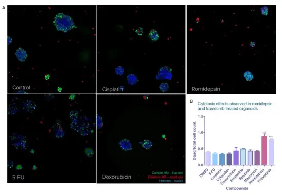 図5. A)化合物処理後のCRCオルガノイドに対して生存率アッセイを実施し、染色およびイメージングを行いました。Calcein AM(生細胞、緑)、エチジウムホモジマー(死細胞、赤)、Hoechst(全核、青)で染色された代表的な画像を示しています。B)各化合物処理群における死細胞(Hoechstおよびエチジウムホモジマー陽性)の割合を示しています。ロミデプシンおよびトラメチニブ処理群では、コントロールと比較して有意に死細胞が増加しました(p<0.001)。
