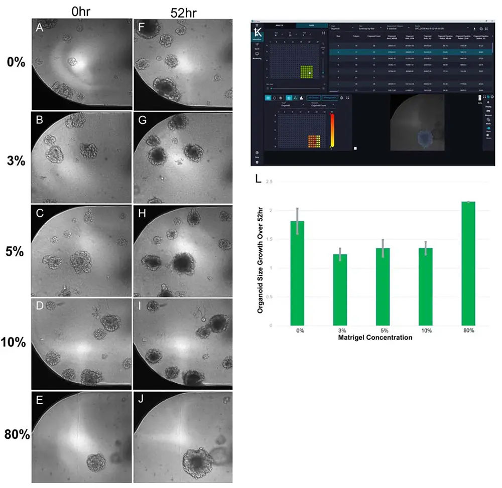図3. オルガノイドとMatrigel濃度の関係 (A) 0%(培地のみ)、(B) 3%、(C) 5%、(D) 10%、(E) 80% Matrigelで培養開始時(0時間)の混合状態、(F)〜(J) 各濃度で52時間後のオルガノイドの成長、(K) IN Carta®画像解析ソフトウェアによるオルガノイド面積の測定、(L) Matrigel濃度別の52時間における平均成長率(誤差棒は標準偏差)