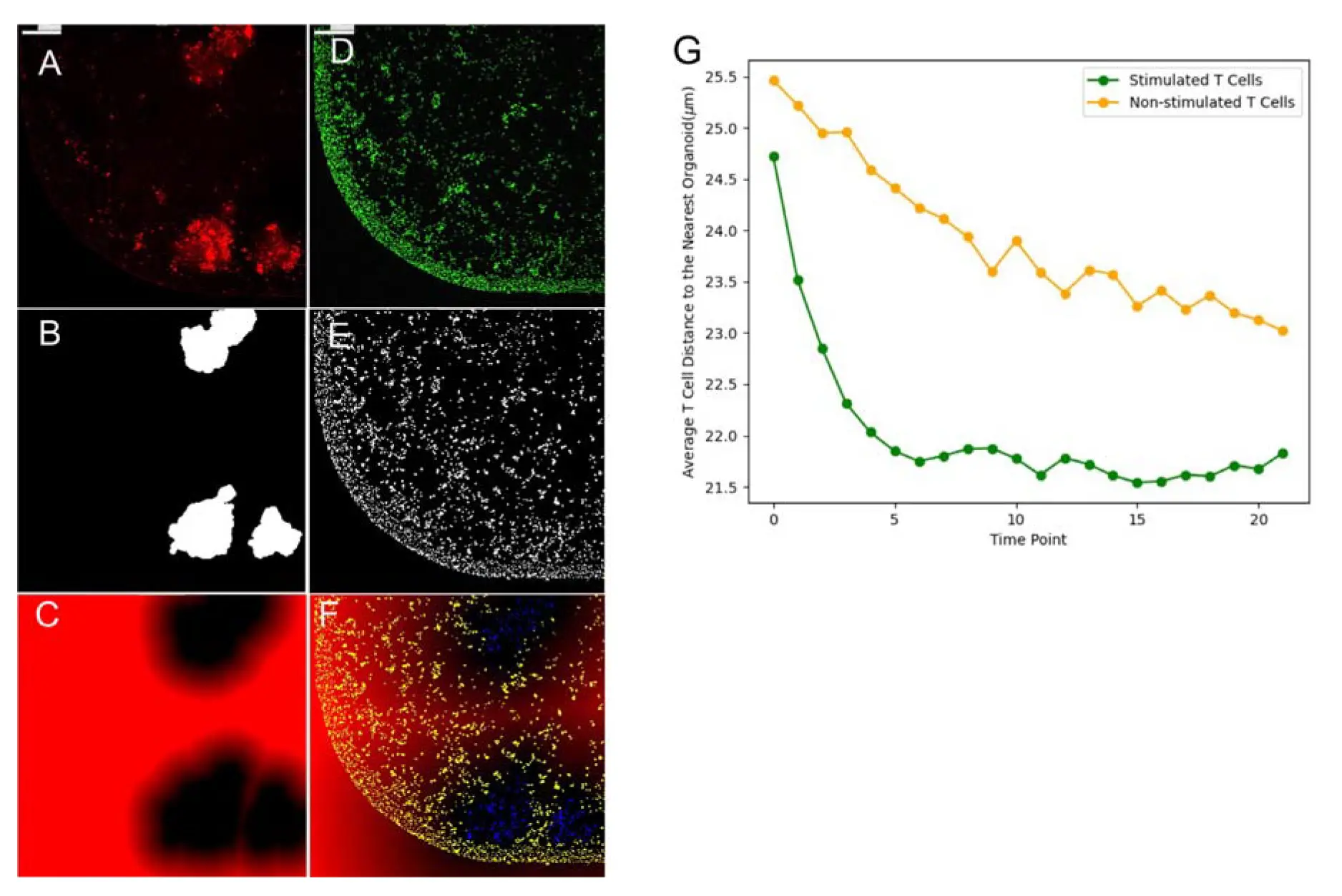 図5. T細胞とオルガノイドの距離解析手法 (A) MitoTracker Redによるオルガノイド内ミトコンドリアの染色、(B) MitoTracker染色から生成されたオルガノイドマスク(境界の定義、 (C) 各画素が最近傍のオルガノイド境界までの距離を示す16ビットグレースケール画像、(D) CellTracker GreenによるT細胞の染色、(E) CellTracker染色から生成されたT細胞マスク、(F) (C)と(E)を重ね合わせて、各T細胞から最近傍オルガノイドまでの距離を測定、(G) 同一処理群(刺激群10ウェル、非刺激群5ウェル)における全タイムポイントでのT細胞平均距離