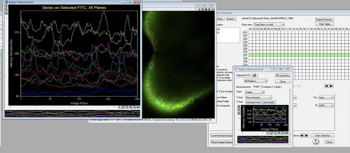 図4. MetaXpressソフトウェアによる領域選択設定と、視細胞活動の時間×強度標準偏差プロット