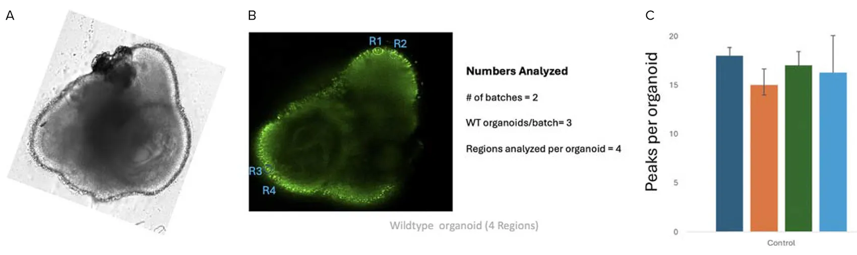 図8. A. 代表的な野生型網膜オルガノイドの透過光(TL)画像を共焦点顕微鏡で取得し、解析対象として選択された毛状の光受容体領域を強調表示しています。B. FITCチャネル(発光波長:520/28nm)で取得された網膜オルガノイドのCalcium 6画像。取得後に4つの領域(R1、R2、R3、R4)が選択されました。この解析では、1バッチあたり3つの野生型オルガノイドを含む2バッチを使用し、各オルガノイドから4領域を選定しています。C. 2つのバッチに含まれる野生型オルガノイドにおけるピーク数を示しており、各オルガノイドの各領域で観察されたピークの数を表しています。D. 同一オルガノイドの4領域(R1、R2、R3、R4)におけるFITCチャネル(発光波長:520/28nm)で記録された強度の標準偏差の時間変化プロット。これらのプロットは、オプトジェネティクス刺激後の各領域の活性を示しており、カルシウムフラックスの動態を時間的に捉えています。