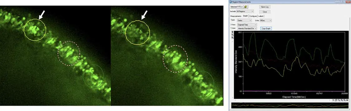 図6. 0倍画像では、網膜オルガノイド内でCalcium 6による蛍光活性が認められる特定領域が強調されています。強度の標準偏差と時間の関係を示すプロットにより、最も顕著な強度変化が(矢印で)示されています。Calcium 6の活性は、カルシウム流入および光受容体の活性化を制御する細胞膜上のゲート機構を調節します。