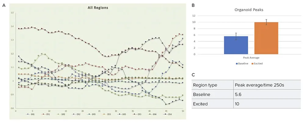 これらの設定により、オプトジェネティクスによる活性化とそれに続く蛍光応答を精密に追跡することができ、オルガノイド内の神経活動の解析を高精度で実施することが可能となりました。
