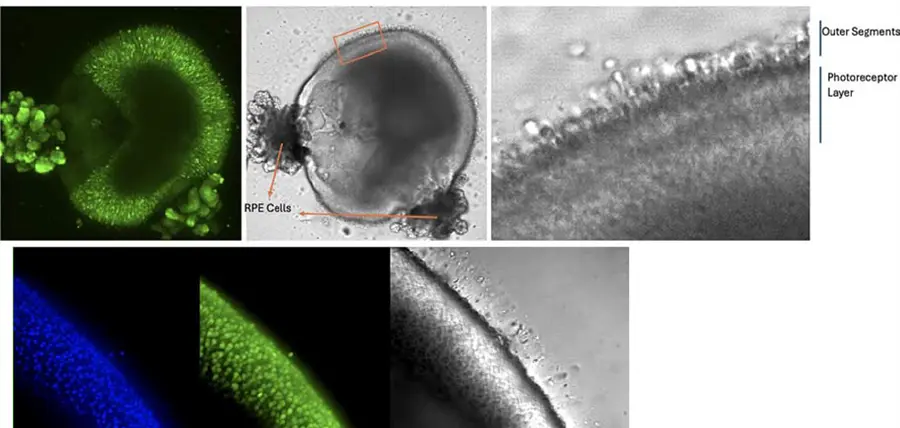 網膜オルガノイドは、ヒト網膜の主要な特徴を再現しており、特に視細胞層においては、桿体および錐体細胞が秩序だった外節構造を形成し、光の検出に関与しています。これらの視細胞は頂端側へと伸長し、光の捕捉および視覚シグナルの開始に寄与します。ただし、すべての網膜オルガノイドが明瞭な網膜色素上皮(RPE)層を形成するわけではなく、特に成熟度の高いオルガノイドではその形成にばらつきが見られます。RPEが明確に形成されていない場合でも、視細胞は機能的な活性を示すことが可能です。