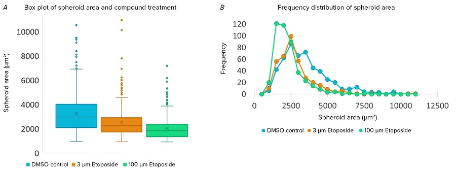 CellReporterXpressソフトウェアを使用して、ウェル内の各スフェロイドの集団をより深く理解するために、スフェロイド単位のデータを確認しました。また、集団レベルの測定データは.csv形式でエクスポートし、Microsoft Excelでさらに解析を行いました。データをボックスプロットとして可視化したところ、各条件において、集団の中で外れ値となる大きなスフェロイドが複数存在することが示されました(図2A)。一方、データを頻度プロットとして可視化すると、エトポシドの低濃度および高濃度のいずれにおいても、サイズが2500–5500 μm²の大きなスフェロイドの数が減少していることが分かりました(図2B)。 興味深いことに、高濃度のエトポシド処理では、サイズが500–2000 μm²の小さな構造体の数が増加していました。このことは、大きなスフェロイドサイズの減少には増殖抑制が関与している可能性がある一方で、より高濃度の化合物処理では細胞死やスフェロイド構造の崩壊がより大きな役割を果たしている可能性を示唆しています。