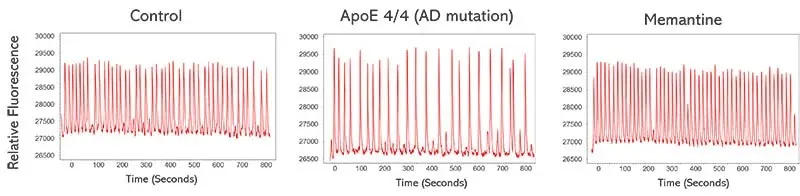 in vitroシステムは、疾患関連の特定変異を有するiPSCラインから細胞を誘導することで、アルツハイマー病やパーキンソン病などの神経疾患をモデル化する有望な手段です。変異はiPSCの遺伝子改変によって導入するか、関連変異を持つ人物から取得します。興味深いことに、疾患関連のApoE 4/4遺伝子変異を有するiPSC由来ニューロンから作製された3Dニューロスフェロイドは、カルシウムオシレーションの機能的プロファイルに変化を示しました *2,7。さらに、アルツハイマー病治療に使用される一部の薬剤(例:メマンチン)は、変化したカルシウムオシレーションパターンを「補正」し、表現型を正常に戻しました。このようなモデルは、疾患関連の活動表現型を補正できる化合物を同定するアッセイとして利用できます。